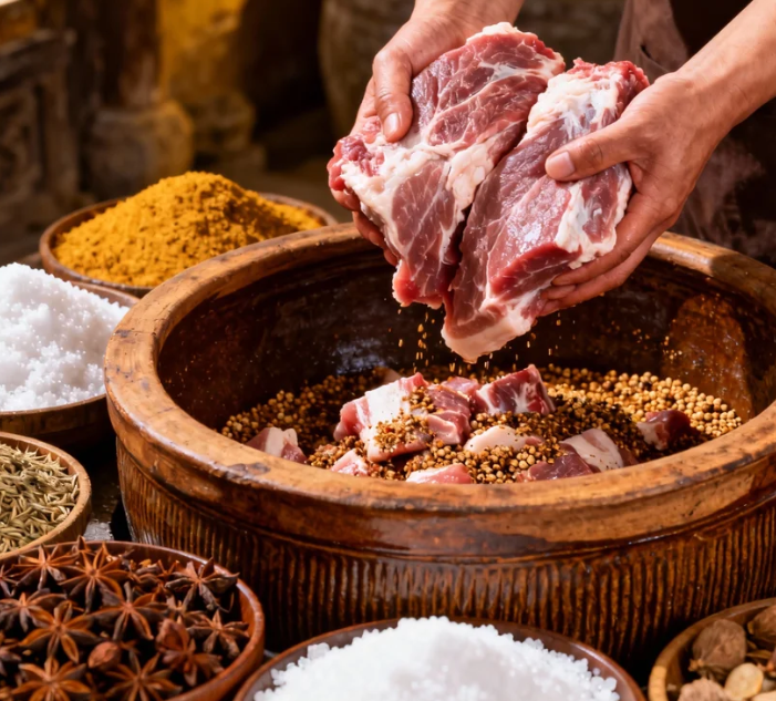 腌肉备年:大雪节气一到,家家户户忙着腌制“咸货”。用八角、花椒、盐等调料精心腌制,再挂在朝阳屋檐下晾晒,迎接新年。